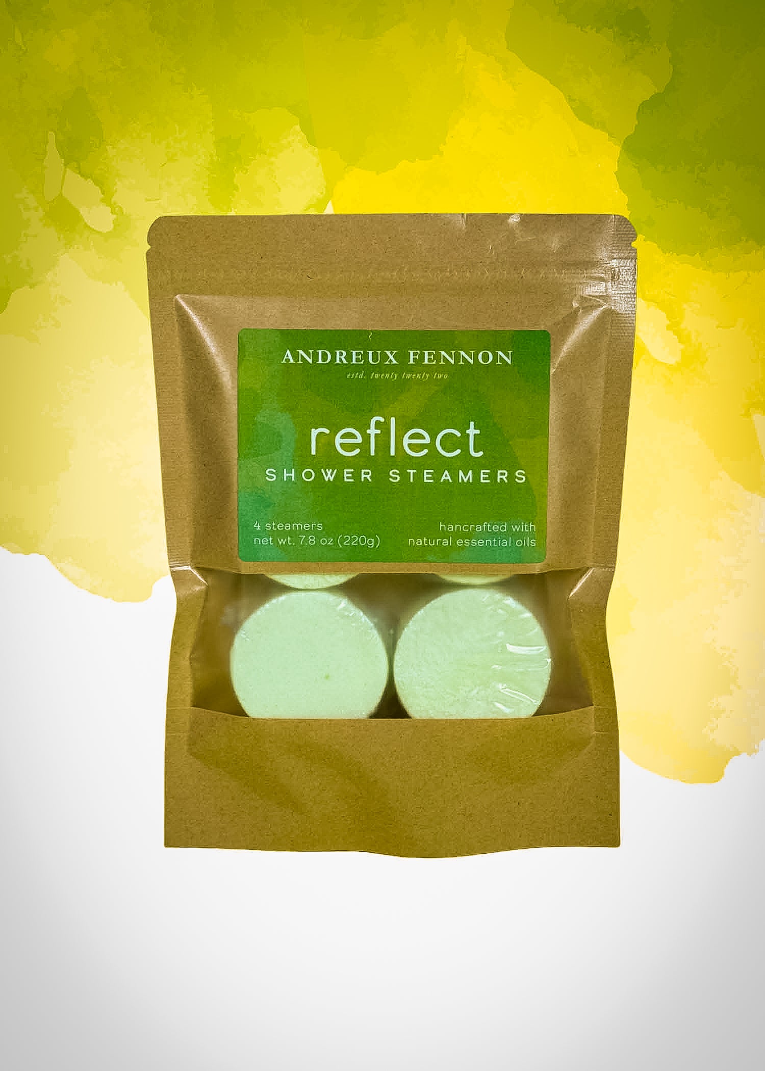 Elevate your focus with Reflect, a four-piece shower steamer collection crafted to awaken mental clarity and spark fresh energy. This stimulating blend fuses bright Orange and Litsea Cubeba with cooling Eucalyptus, Cornmint, and Peppermint, layered with herbal Rosemary and Basil, and grounded by earthy Patchouli and Cedarwood.