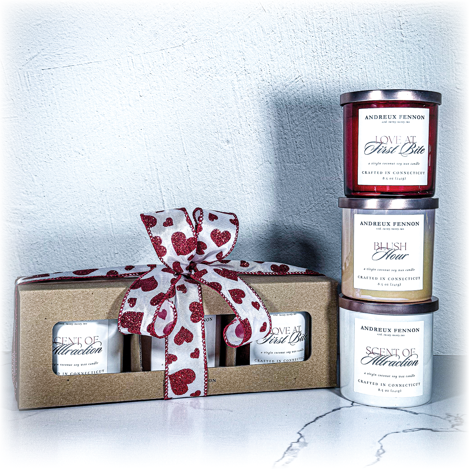 Allow your heart to bask in the glow of our enchanting 3-Piece Valentine’s Day Candle Collection, a trio crafted to sweep you into love’s most intoxicating embrace. “Scent of Attraction,” “Blush Hour,” and “Love at First Bite” unite to conjure a haven of devotion and delight, each flame dancing with the promise of passion and tenderness.